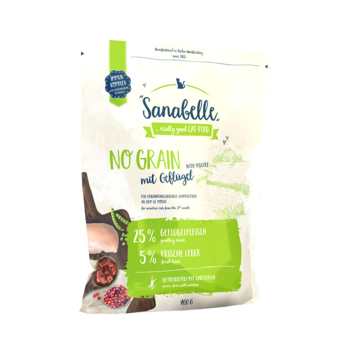 Разработан корм Бош Санабелль Беззерновой для кошек с пищевой непереносимостью и страдающих аллергией на еду. Для кошек, которые постоянно находятся в закрытых помещениях и при этом мало двигаясь - этот рацион как нельзя лучше подходит им из-за быстрой усвояемости. В сухом корме Бош Беззерновой нет глютена и сои и используются, только натуральные ингредиенты: свежее мясо домашней птицы. Поэтому эти корма так нравятся кошкам. Используемый жир и растительные волокна уменьшают слипание шерсти в желудке и облегчают выход волосяных шаров. Уменьшается объем порций и при этом облегчается переваривание пищи, так как из-за питательности корма Sanabelle No Grain, состоящего из чистого мяса, кошка быстро насыщается. Правильная работа пищеварительной системы, улучшение кишечной флоры, эластичность кожи, сохранение зрения, естественная сопротивляемость организма – все это благодаря сухому корму Бош Санабелль Беззерновой. А так же: стимуляция работы почек, поддержание водного баланса, предотвращение образования камней. Так как изобретенный водный транзит-агент, разработанный специально для кошек, ведущих малоактивный образ жизни - это изобретение фирмы Бош, лучший из кормов. Он поддерживает водный баланс в организме, снижает рН мочи, поддерживает содержание магния в норме.