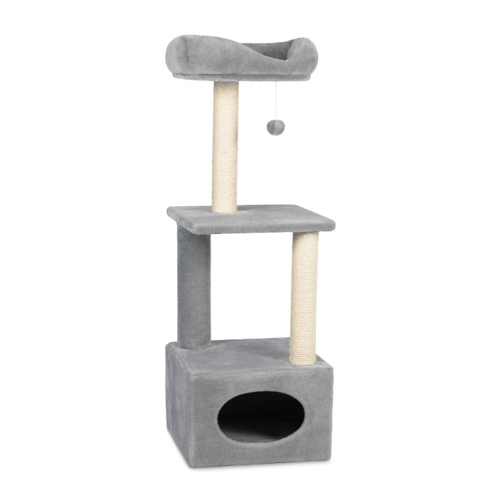 Развлекательный комплекс с домиком позволит направить энергию котика в нужное русло: по площадкам можно прыгать, столбики-царапки с обмоткой из сизаля позволят удовлетворить естественные потребности в заточке когтей. Конструкция компактная, легко перемещается по дому, органично вписывается в интерьер.