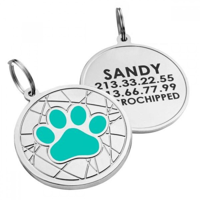 Эмалированный Адресник для Собак BronzeDog Лапка на Фоне Объемной Паутинки Бирюзовый