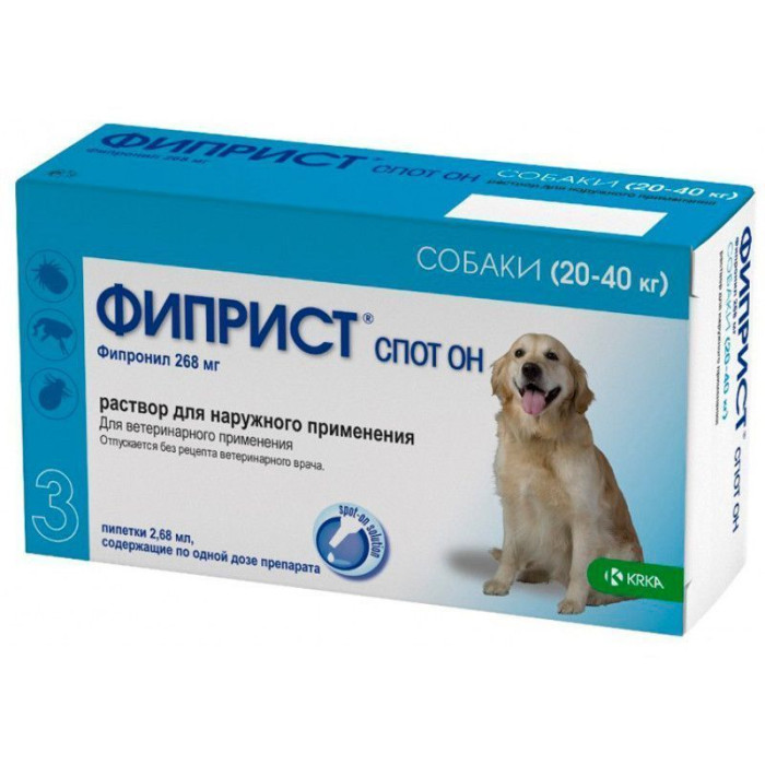 Фиприст Спот Он для собак живой массой от 20 кг до 40 кг активен в отношении половозрелых фаз развития блох и всех фаз развития иксодовых клещей, а также власоедов, вшей, комаров и саркоптоидных клещей, в том числе ушных клещей.