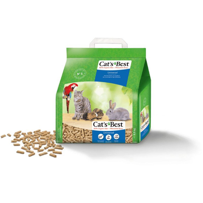 Универсальное использование для большинства мелких пород животных. Мы рекомендуем Cat's Best Universal в качестве наполнителя для домашних хозяйств, которым приходится одновременно заботиться о нескольких разных мелких животных. Благодаря высокой мощности впитывания Cat's Best Universal также идеально подходит в качестве дополнительной подстилки для влажных помещений, таких как поилки и т.п. в животноводческих помещениях. Подходит для грызунов, птиц и кошек. Изготовлен из 100% растительных волокон.