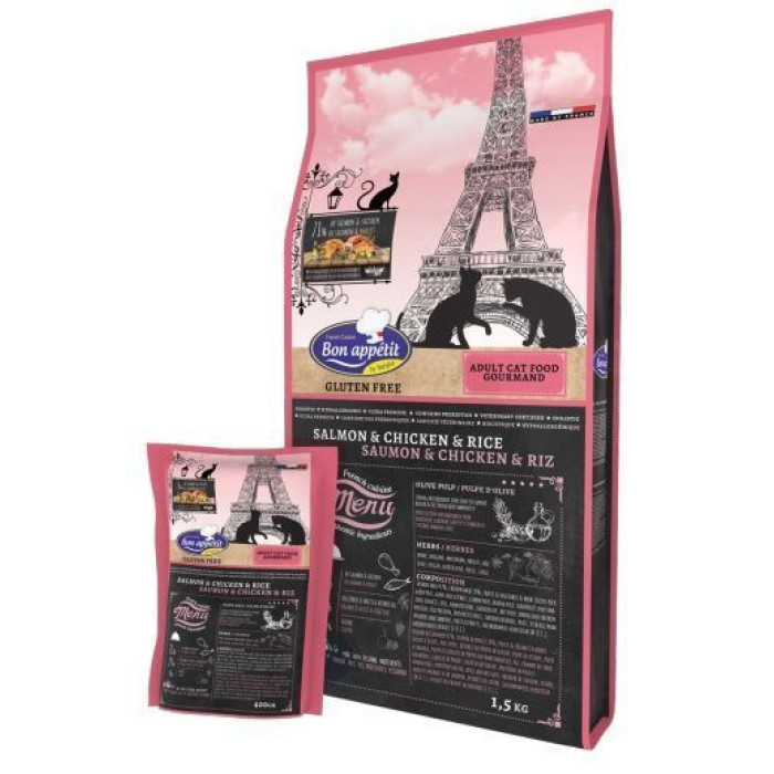 с 70% лосося и куриного мяса, Bon App'etit обеспечивает большинство питательных веществ для котят при соблюдении их физиологических потребностей.