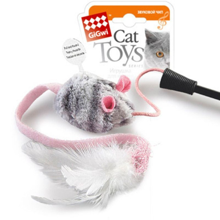 Игрушка для кошек на стеке, со звуковым чипом, с мышкой и перьями. Отлично подойдет для веселых игр с вашим питомцем.