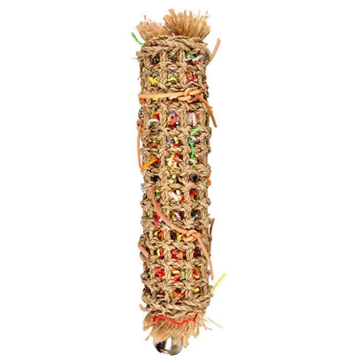 Игрушка представляет собой сетку, сплетенную из лозы. Она достаточно плотная и хорошо держит форму, чтобы птица на ней чувствовала себя уверенно. На конце сетки закреплен колокольчик, а внутренняя часть наполнена узкими разноцветными полосками бумаги и отрезами джутового волокна. В хаотичном порядке к ячейкам сетки прикреплены шнуры из неокрашенной натуральной кожи, которые завязаны в узел. Ваш попугай будет в восторге от возможности исследовать текстуры, клевать лозу и джут, развязывать узлы, копаться в бумажных полосках и слушать трели мелодичного колокольчика.
