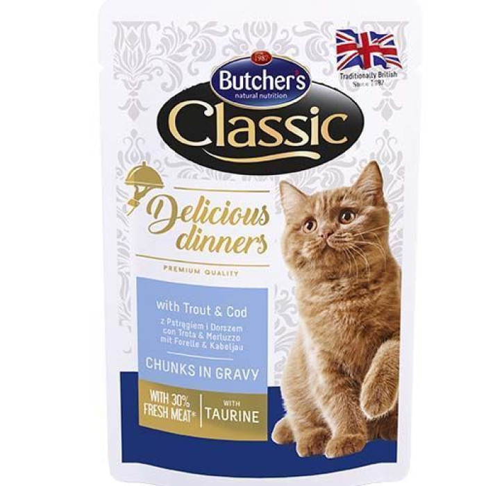 Консервы для кошек Butchers Classic Delicious Dinners, форель и треска в соусе, пауч 100г