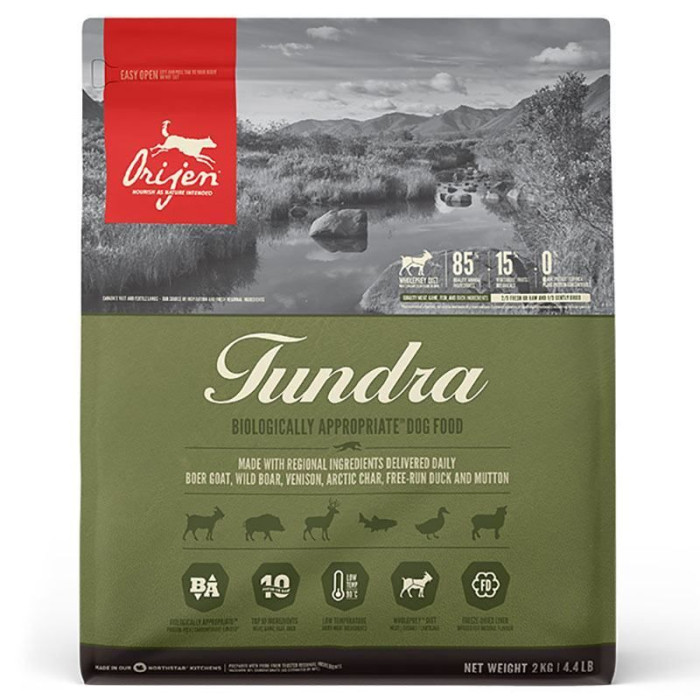 Рацион Ориджен Тундра обеспечит вашего питомца питательными протеинами и нутриентами из свежего мяса козы, дикого кабана, оленины выращенной на ранчо, арктического гольца, утки и баранины.