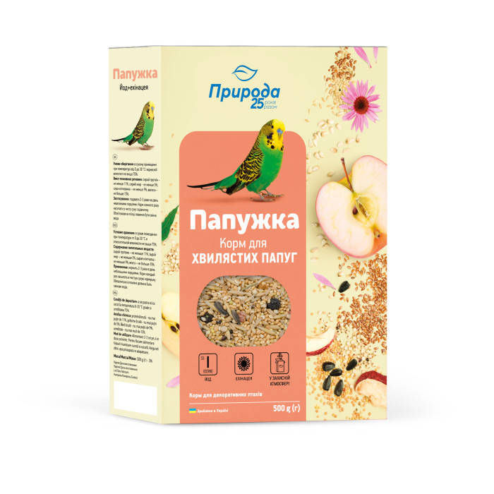 Рецептура корма разработана на основе рекомендаций ведущих специалистов по разведению и содержанию декоративных птиц. Набор зерновых культур соответствует рациону птицы в естественных условиях. Регулярное употребление корма позволяет избежать авитаминозов, неправильной или затяжной линьки, обеспечивает птицам хорошую кондицию. Йод нормализует обмен веществ и помогает избежать расстройств, связанных с содержанием клетки. Эхинацея способствует активизации метаболических процессов, повышению жизненного тонуса птицы.