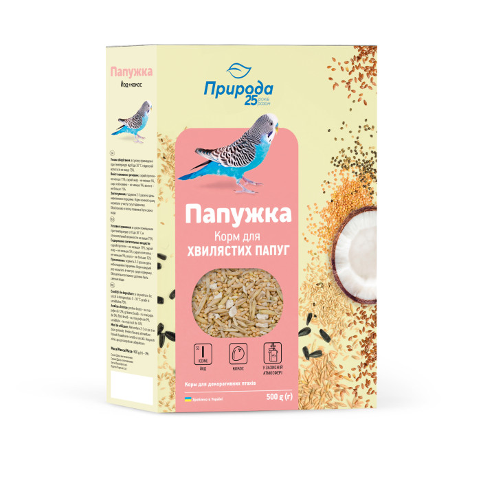 Рецептура корма разработана на основе рекомендаций ведущих специалистов по разведению и содержанию декоративных птиц. Набор зерновых культур соответствует рациону птиц в естественных условиях. Регулярное употребление корма позволяет избежать авитаминозов, неправильной или затяжной линьки, обеспечивает птицам хорошую кондицию. Йод нормализует обмен веществ, помогает избежать проблем, связанных с содержанием птиц в клетке. Кокосовая стружка является источником незаменимых жирных кислот, способствующих укреплению иммунитета, улучшает обмен веществ и липидный обмен, стимулирует пищеварение.