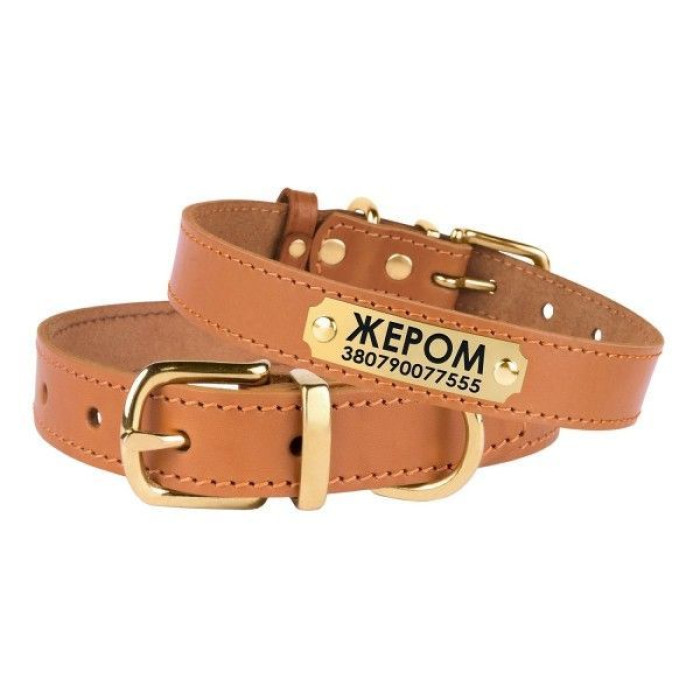 Этот ошейник может быть укомплектован адресником из латуни на заклепках с возможностью нанесения до 4 строк текста в зависимости от его размера.