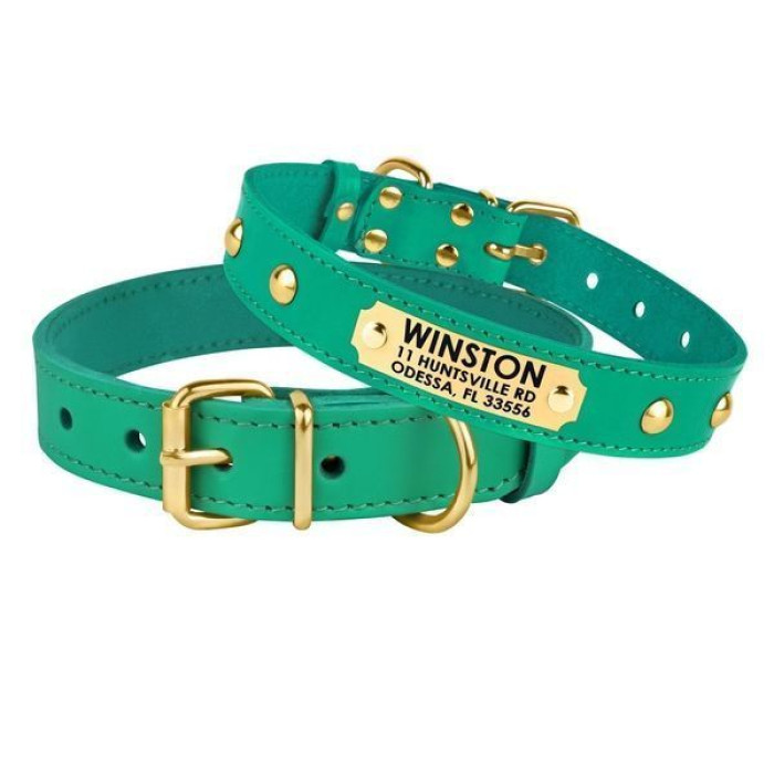 КОЖАНЫЙ ОШЕЙНИК ДЛЯ СОБАК С ЗОЛОТИСТОЙ ФУРНИТУРОЙ ЗАКЛЕПКАМИ И АДРЕСНИКОМ ИЗ ЛАТУНИ