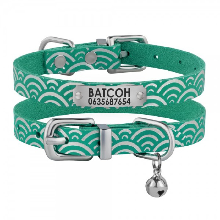 Ошейник для кошек кожаный Classic одинарный с серебряным тиснением Море, Бирюзовый, 2XS 18-25 см