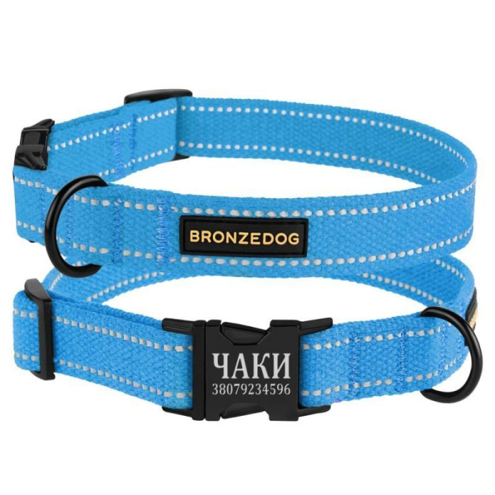 Ошейник для собак Bronzedog Сotton рефлекторный х/б брезент c металлической пряжкой, Голубой S 25-33 см
