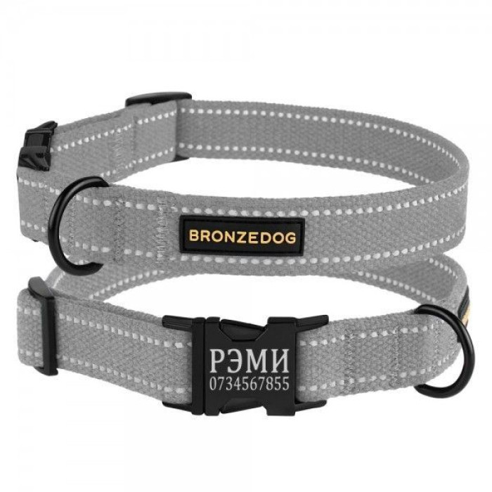 Ошейник для собак Bronzedog Сotton рефлекторный х/б брезент c металлической пряжкой, Серый XL 43-66 см