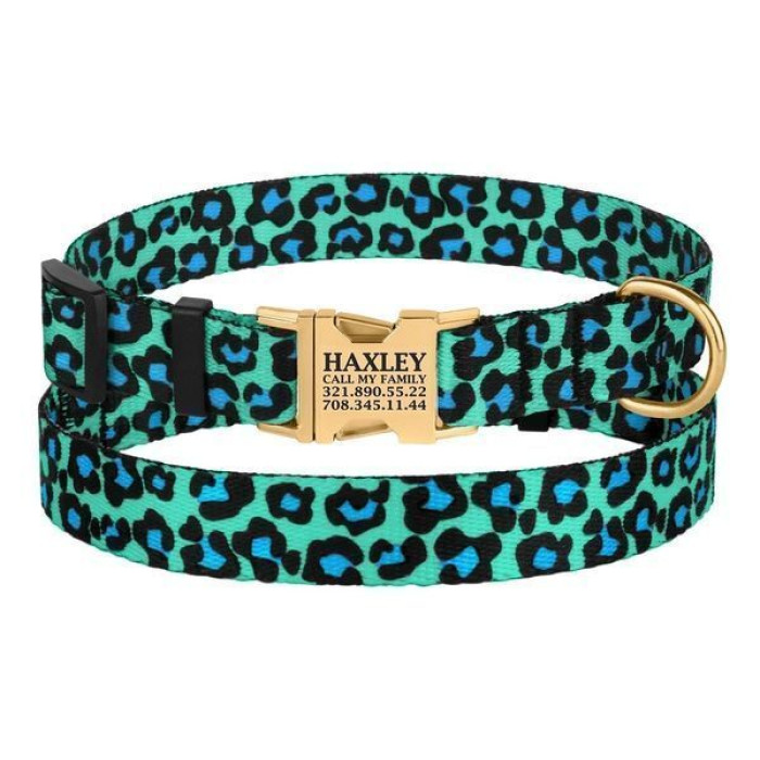 Ошейник для собак BronzeDog Urban нейлоновый c золотистой пряжкой, бирюзовый леопард S 25-33 см