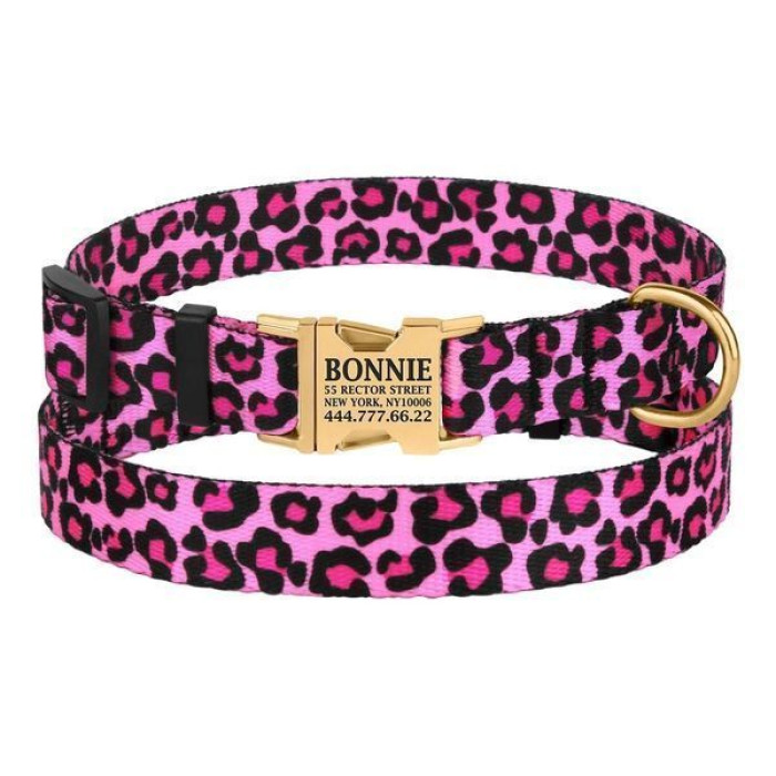 Ошейник для собак BronzeDog Urban нейлоновый c золотистой пряжкой, розовый леопард