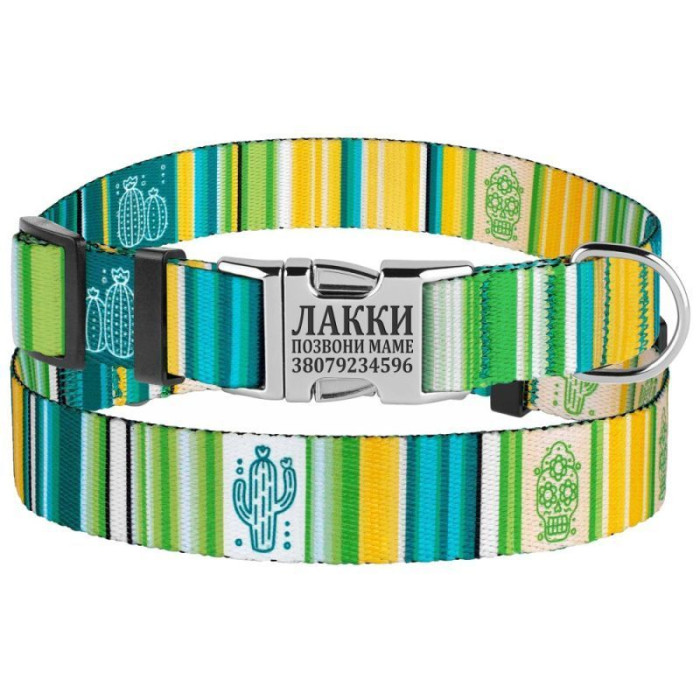 Ошейник укомплектован прочной металлической пряжкой с возможностью нанесения гравировки.
