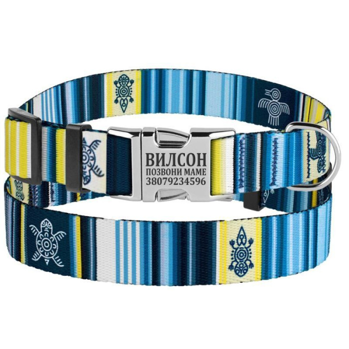 Ошейник укомплектован прочной металлической пряжкой с возможностью нанесения гравировки.