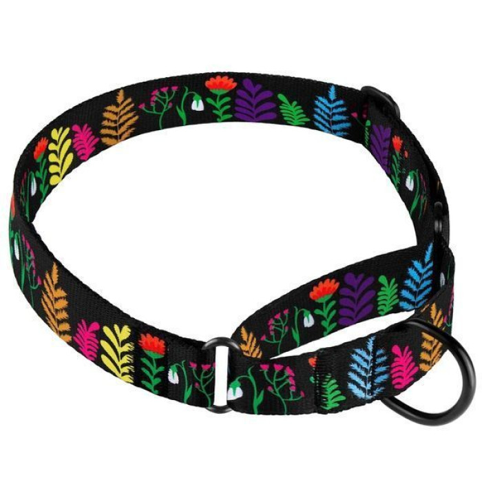 Ошейник для собак мартингейл BronzeDog Urban нейлоновый c металлической фурнитурой, принт цветы, Черный M 38-51 см