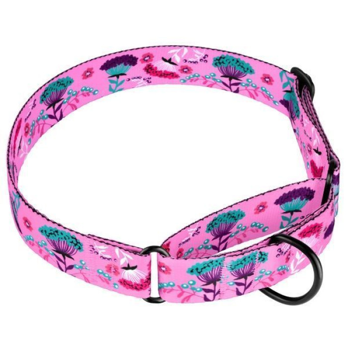 Ошейник для собак мартингейл BronzeDog Urban нейлоновый c металлической фурнитурой, принт цветы, Розовый M 38-51 см