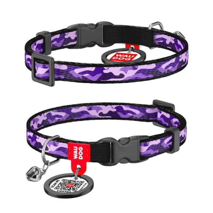 Ошейник WAUDOG Nylon с QR паспортом для котов и мелких собак, рисунок "Фиолетовый камо", пластиковый фастекс XS 20-30 см