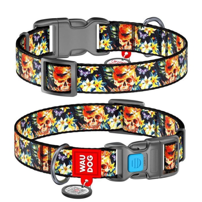 Ошейник WAUDOG Nylon с QR паспортом, рисунок "Гламурные черепа", пластиковый фастекс S 25-35 см
