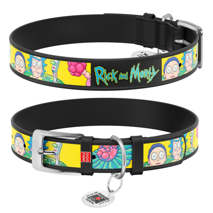Ошейник для собак кожаный WAUDOG Design с QR паспортом, рисунок "Рик и Морти 1" черный, XL, 35 мм, 46-60 см