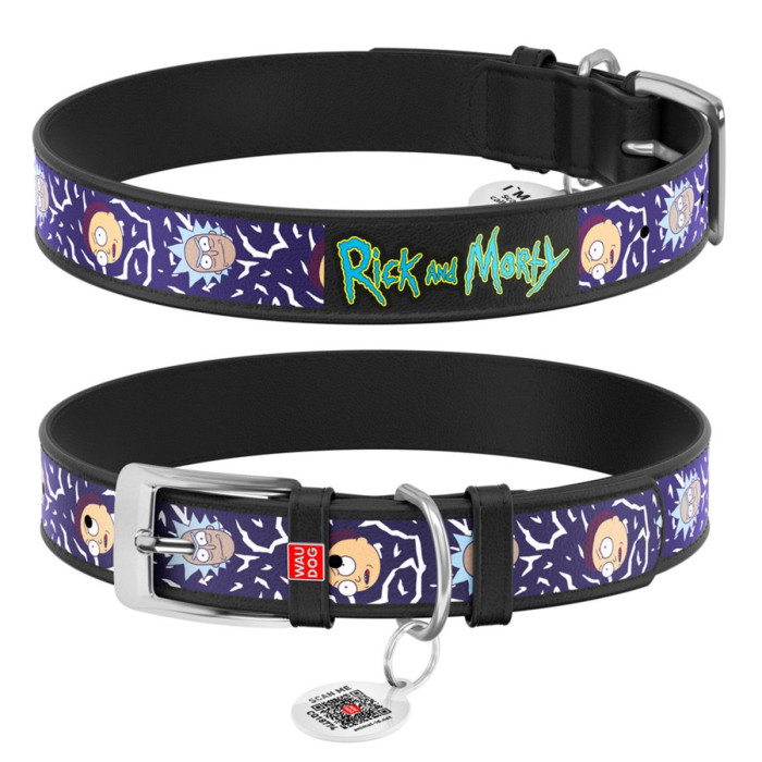 Ошейник для собак кожаный WAUDOG Design с QR паспортом, рисунок "Рик и Морти 2" черный, M, 20 мм, 30-39 см