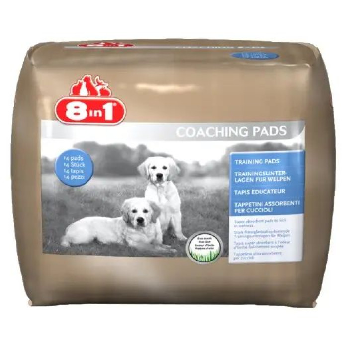 8in1 Приучающие пеленки поглощают большое количество жидкости, устраняют неприятные запахи, и, благодаря их специально разработанной микроструктуре, они практичны и очень прочны. Пропитаны специальным составом со свежим ароматом трав для ассоциации с улицей.