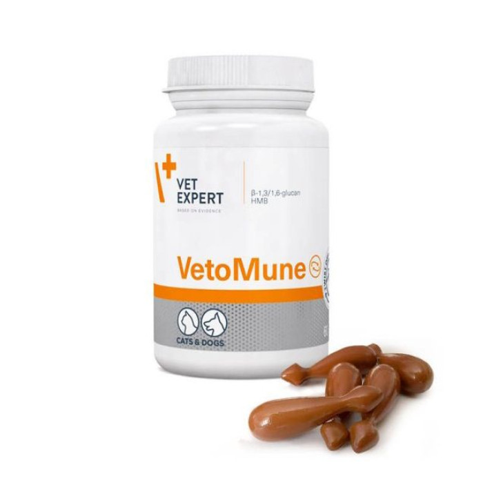 VetoMune (ВетоМун) - пищевая добавка помогает поддерживать как гуморальный,так и клеточный неспецифический иммунитет у собак и кошек. Предназначен для щенков и котят, стареющих собак и кошек, животных с повышенным риском заражения или больных вирусными и бактериальными заболеваниями, а также беременных сук и кошек для стимуляции адекватного уровня материнского иммунитета, обеспечивающего колостральный иммунитет у потомства.