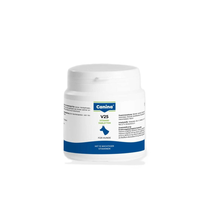Для того чтобы обеспечить организм всеми необходимыми витаминами и дополнить рацион животного важными аминокислотами специально был разработан продукт V25, содержащий комплекс из 12 основных витаминов и важнейших аминокислот. V25 способствует здоровому росту и правильному развитию всех систем организма щенков и молодых собак, стимулирует белковый и жировой обмен, способствует качественному и правильному процессу кроветворения.