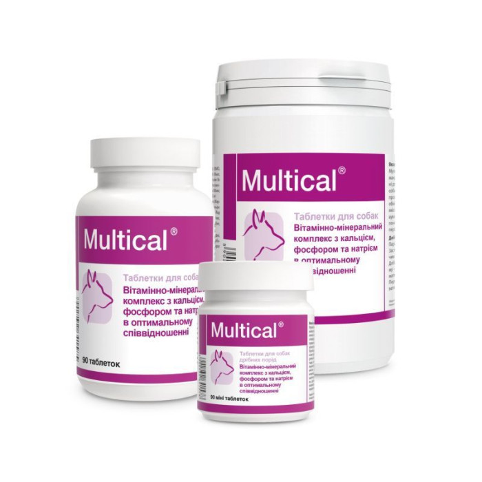 Мультикаль содержит витамины, микро- и макроэлементы в оптимальном соотношении необходимы для правильного развития и функционирования организма собаки. Имеет идеальное соотношение кальция и фосора.