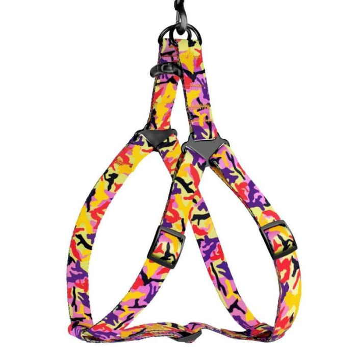 Высокопрочный нейлон, из которого изготовлена шлея, не теряет цвет при стирке и не выгорает на солнце.