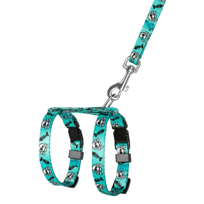 Шлея с поводком для кошек и мелких собак BronzeDog Urban Черепа Бирюзовая XS