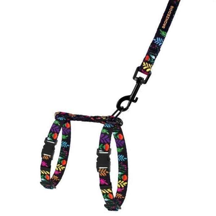 Шлея с поводком для котов и мелких собак BronzeDog Urban Цветы, Черная 2XS