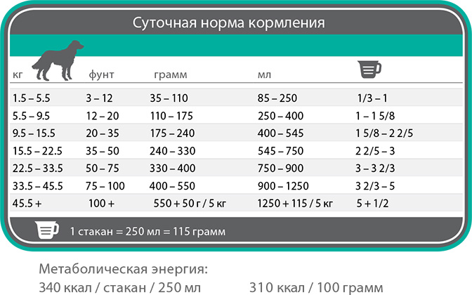 Зазначені норми годівлі відносяться лише до сухого корму і можуть змінюватись в залежності від особливих потреб тварини.