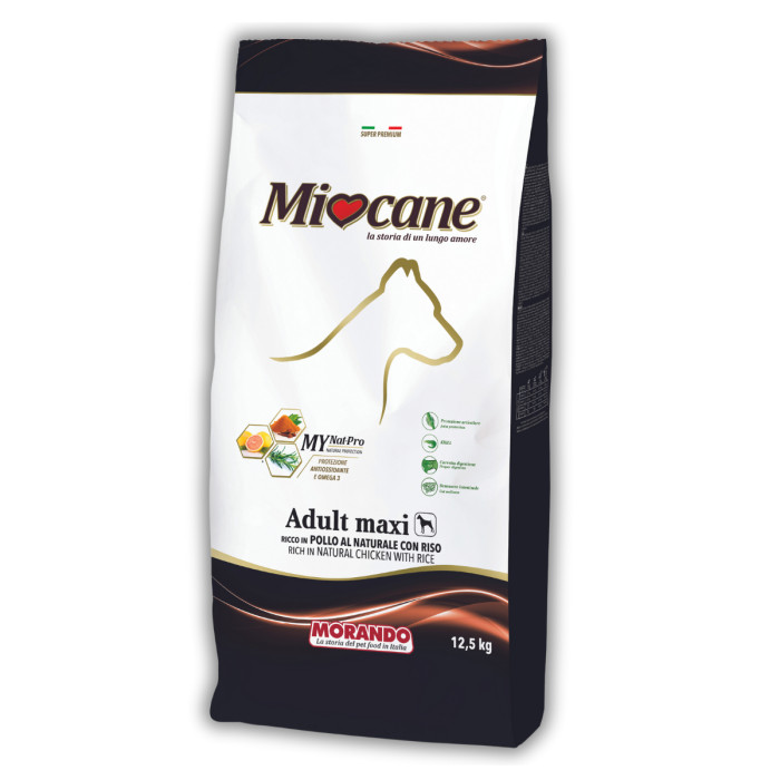 Сухой корм для собак крупных и гигантских пород Morando MioCane Maxi производится по уникальной технологии, при которой мясо не замораживается, а подвергается натуральной обработке, идентичной процессу пищеварения в желудках собак. Это позволяет сохранить большее количество витаминов, питательную ценность и в несколько раз снизить риск возникновения аллергических реакций, что может быть очень актуально для собак с чувствительным пищеварением. В состав корма входит глюкозамин и хондроитин сульфат для здоровья суставов и профилактики болезней опорно-двигательного аппарата, что жизненно важно для больших собак.
