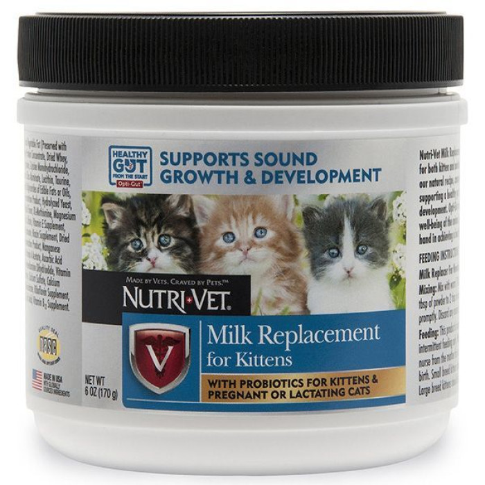 Nutri-Vet Milk Replacement for Kittens – сухой заменитель кошачьего молока для новорожденных котят. Питательная молочная смесь содержит белки, жиры и углеводы, а также витамины, минералы, аминокислоты и пробиотики, которые необходимы для развития новорожденного котенка. Смесь изготовлена на основе оптимального состава и технологии приготовления Opti-Gut.