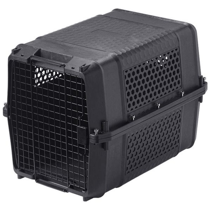 Жесткая конструкция корпуса изготовлена из прочного пластика, на 98% состоящего из переработанного сырья. Корпус собирается из двух идентичных частей при помощи защелок, соединение фиксируется металлическими болтами с гайками (крепеж входит в комплект). Все углы внутри бокса широко закруглены в целях безопасности. В крышке бокса имеются множественные вентиляционные отверстия, расположенные на 3-х боковых сторонах по периметру и обеспечивающие отличный приток воздуха внутрь бокса, а также удовлетворяющие требованиям IATA о 4-сторонней вентиляции. Отверстия специально выполнены не слишком большими, чтобы ваш питомец не мог просунуть в них нос или лапу и пораниться при транспортировке.