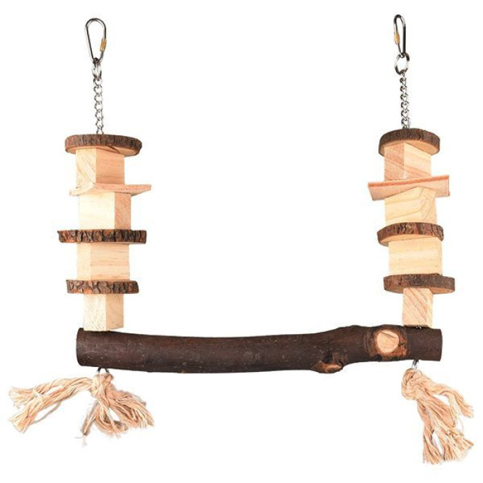 Жердка гойдалки для папуг підвішується за допомогою металевого ланцюжка з нероз'ємними ланками та металевих карабінів. На ланцюжок нанизані з обох боків дерев'яні елементи різної геометричної форми, а також кілька шматочків натуральної незабарвленої шкіри. Елементи вільно переміщаються вздовж ланцюжка та обертаються. Ваш папуга буде в захваті від можливості досліджувати текстури, клювати, точити дзьоб, рухати та обертати елементи.