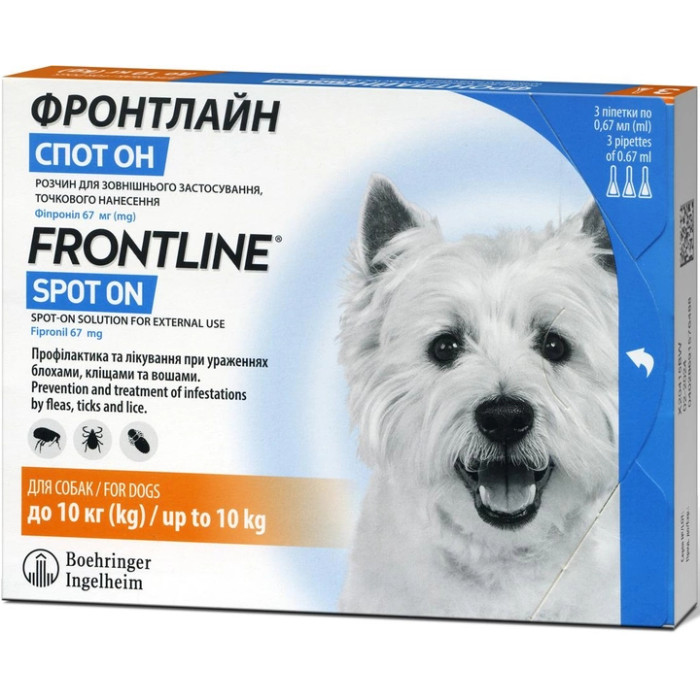 - Менше, ніж за 24 години природним чином препарат сам поширюється по всій поверхні тіла Вашої тварини. Уникайте потрапляння FrontLine (Фронтлайн) на руки. :