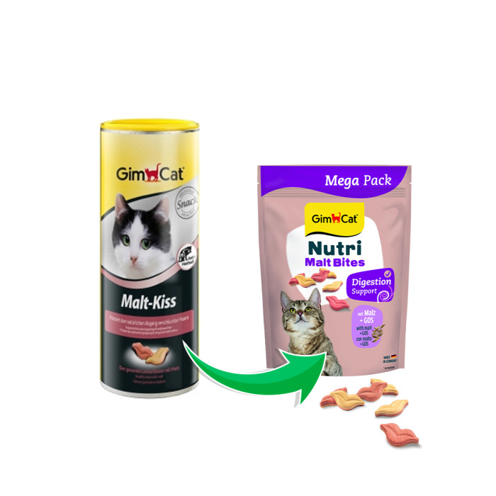 GimCat Nutri Malt Bites з ароматним солодовим екстрактом – це смачна закуска у формі губ. Солод, клітковина та ГОС позитивно впливають на здоров'я кишківника.