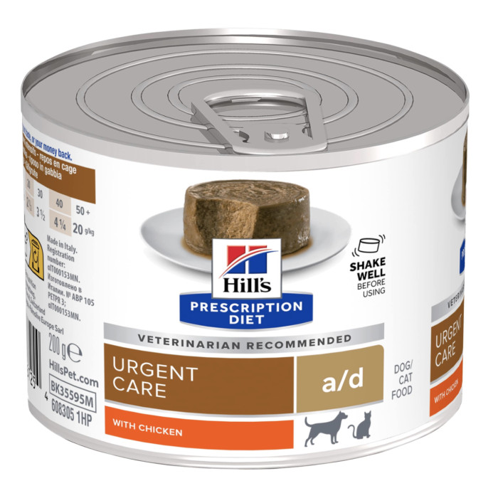 Hill’s a/d є ідеальним рішенням у важких випадках, таких як стрімке схуднення, анорексія, відмова від їжі або недоїдання. Він забезпечує максимальну поживну підтримку, а висока смакова привабливість стимулює апетит навіть у найвибагливіших або ослаблених тварин.