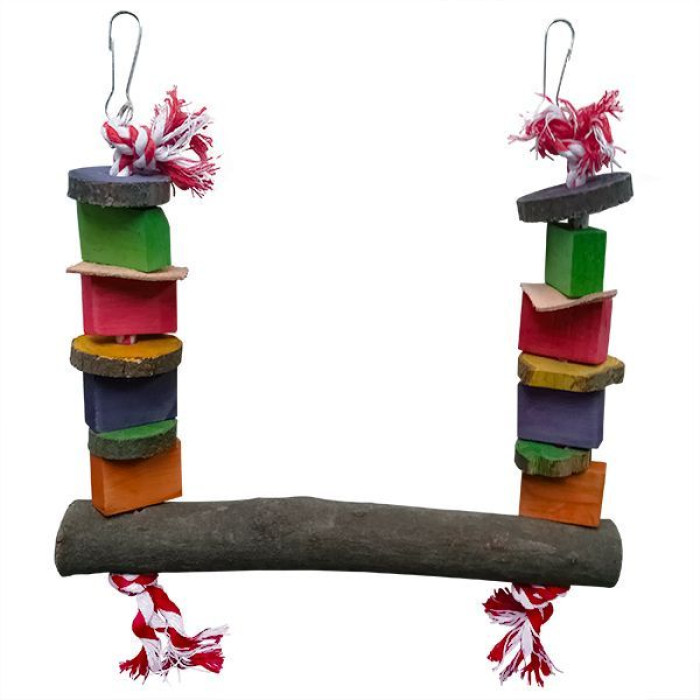 Жердка гойдалки для папуг підвішується за допомогою канатів, скручених з бавовняних ниток, та металевих карабінів. На канати нанизані з обох боків дерев'яні елементи різної геометрії та кольору, а також кілька шматочків натуральної незабарвленої шкіри. Елементи вільно переміщаються вздовж каната та обертаються. Ваш папуга буде в захваті від можливості досліджувати текстури, клювати, точити дзьоб, рухати та обертати елементи. Пташиних естетів порадує різноманітність яскравих фарб, виконана за допомогою безпечних харчових барвників.