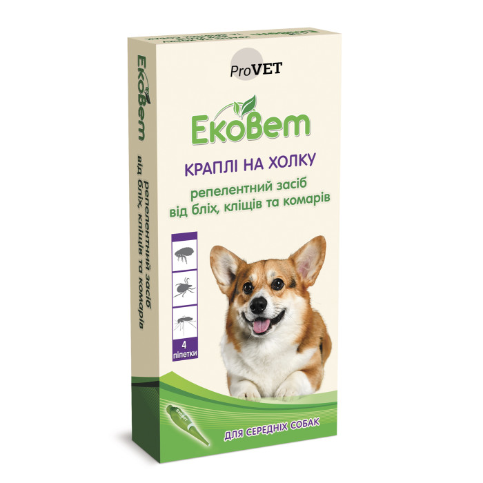 Компоненти продукту мають властивість доповнювати та посилювати дію один одного, за рахунок чого досягається косметичний ефект, маскується неприємний запах від тварин, покращується стан шкіри та вовни. У випадках подразнень та мікротравм на шкірі краплі сприяють більш швидкому загоєнню та відновленню епідермісу. Краплі для зовнішнього застосування для собак дрібних, середніх та великих порід «ЕкоВет» захищають від найпоширеніших видів ектопаразитів і піклуються про бездоганний зовнішній вигляд вашого улюбленця. Засіб має виражений репелентний ефект проти бліх, вошей, кліщів і переносників небезпечних захворювань - комарів, москітів і мух. Це досягається завдяки поєднанню ретельно підібраних виключно природних компонентів: масел герані, маргози, гвоздики та екстракту ванілі.