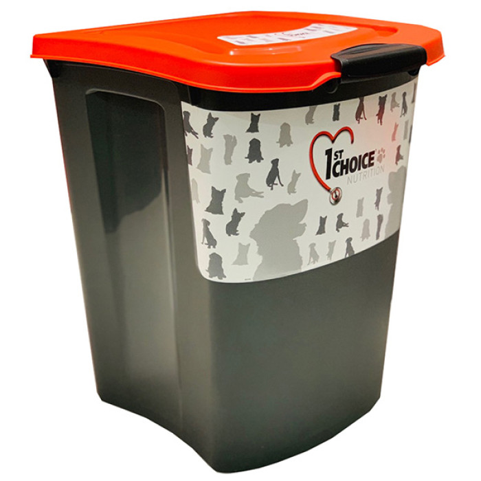 Фірмовий контейнер для корму від 1st Choice – це гарантія збереження смакових якостей, вітамінів, аромату та свіжості сухого корму для собак чи котів. Містка ємність розрахована на запас 15 кг сухого продукту із середнім розміром гранул (35 л).