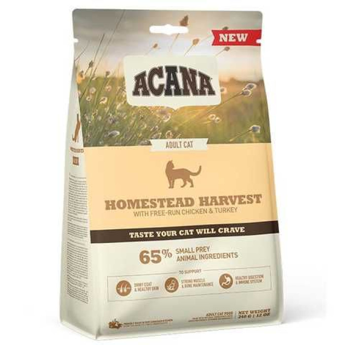 Годуйте вашого дикого кота раціоном наповненим якісними м'ясними інгредієнтами. Новий раціон ACANA Homestead Harvest повний м'яса курчат, вирощених на вільному вигулі, індички та качки у співвідношенні WholePrey, включаючи м'ясо птиці, органи та хрящі забезпечуючи природне харчування вашого кота та смак перед яким він не зможе встояти. Щоб ваш улюбленець завжди залишався здоровим, щасливим та сильним.