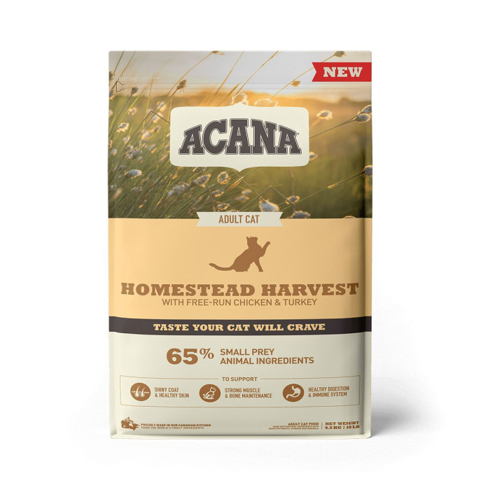 Годуйте вашого дикого кота раціоном наповненим якісними м'ясними інгредієнтами. Новий раціон ACANA Homestead Harvest повний м'яса курчат, вирощених на вільному вигулі, індички та качки у співвідношенні WholePrey, включаючи м'ясо птиці, органи та хрящі забезпечуючи природне харчування вашого кота та смак перед яким він не зможе встояти. Щоб ваш улюбленець завжди залишався здоровим, щасливим та сильним.