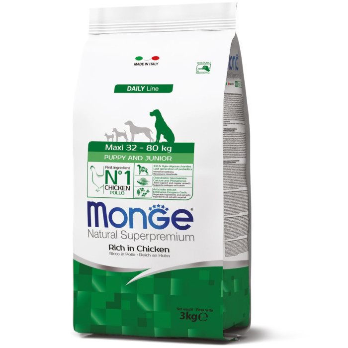 MONGE SUPERPREMIUM DOG MAXI PUPPY&JUNIOR – це повноцінний збалансований раціон для цуценят великих порід відмінно засвоюється і сприяє правильному розвитку цуценя.