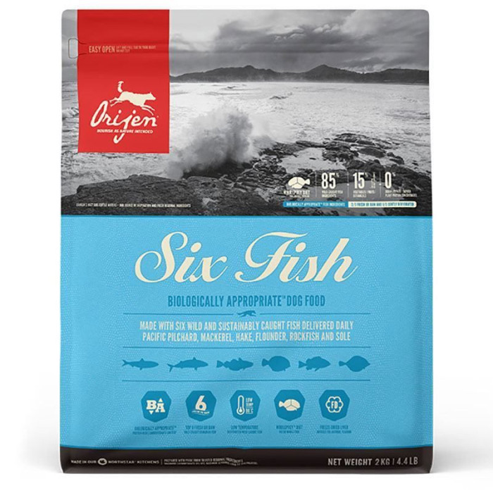 Оріджен Сікс Фіш – переповнений високопоживними протеїнами (38%), з меншою кількістю вуглеводів (18%), що забезпечує природне харчування собак на всіх стадіях життя, відповідно до їх еволюційних та біологічних потреб.