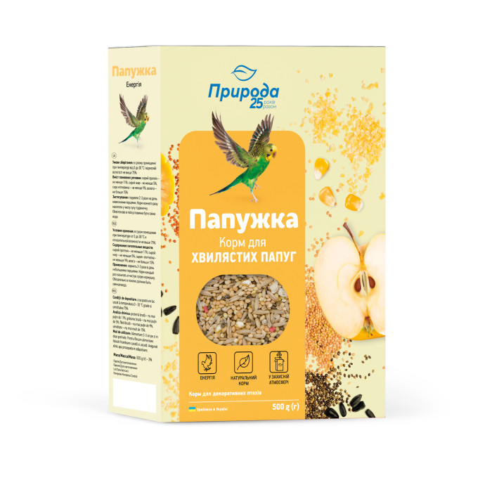 Рецептура корму розроблена на основі рекомендацій провідних фахівців з розведення та утримання декоративних птахів. Набір зернових культур складає оптимальний раціон, що відповідає харчуванню птахів у природних умовах. Вживання такого корму дозволяє уникнути авітамінозів, неправильної або затяжної линьки; гарантує добру кондицію, яскраве забарвлення та завжди гарний настрій. Склад корму забезпечує потреби активних папуг, добре самопочуття у період гніздування та вигодовування пташенят.